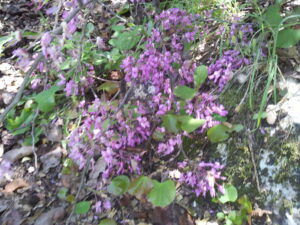 בין עצי החורש, אפשר להבחין בקטלב הבולט בגזעו וענפיו האדומים, ובכליל החורש – עץ נשיר שפורח באביב בוורוד. עליו הגדולים מתארים צורת לב. על ענפי העצים גדלות חזזיות המזכירות ספוג קירצוף. החזזית היא צורת דו-קיום, סימביוזה בין פטריה לאצה. אחת מצורות החיים העתיקות והמוצלחות על פני כדור הארץ. הפטרייה מביאה ל”חתונה” את מערכת האספקה של המים והמינרלים, האצה תורמת את היכולת לבצע פוטו סינתזה. בטבע מתקיימים אלפי מיני חזזיות מאצות ומפטריות שונות.