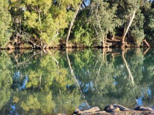 סכר אלומות החדש מהווה חוצץ בין שני חלקיו של נחל הירדן. מצפון לסכר, מי הכנרת המגיעים מסכר דגניה. מדרום לסכר, המים באיכות נמוכה יותר. מים מליחים הנשאבים מהכנרת ומובלים לחלק הדרומי, מי שפכים שעברו טיהור ומי נגר עודפים בעת שיטפונות. תפקידיו של סכר אלומות – לאפשר שאיבה יעילה לחקלאות לשמור על מפלס הכנרת ולתת מענה למצבי שיטפון או בצורת. הסכר גם משפיע באופן חיובי על איכות המים באזור, ואף כולל “סולם דגים” לשמירה על קישוריות אקולוגית בנהר. טיילת מורד הירדן ממשיכה מכאן ועד ל”אי השלום” הסמוך לאשדות יעקב.