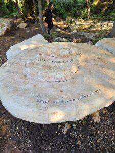 מגיעים אל “חוטם הכרמל”, חלקו הדרומי ביותר של רכס הכרמל. מתקדמים דרומה על שפת הרכס, ש”נופל” לעמק במדרון סלעי ותלול. חוצים שער מנע בקר ומיד לאחריו נראית אנדרטה יפה לזכר “מרים”. לידה חצוב בסלע, “דולמן”. דּוֹלְמֶן הוא מבנה “מגליתי” בנוי מאבנים גדולות, שמקורו לרוב בתקופות פרהיסטורית. מגה – גדול. ליתוס – אבן ביוונית עתיקה. הדולמנים מקושרים לרוב לקבורה. מעט מזרחה מכאן נמצא שדה של כמה עשרות דולמנים.