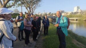יורדים מהגשר אל “חצי האי הירקוני”. סמוך למקום בו נשפך נחל הירקון לים התיכון, סוטה אפיק הנחל צפונה ויוצר חצי אי. במשך מאות שנים היה המקום שטח שומם, מוכה ביצות וחסר ערך התיישבותי. בתקופה שבין מלחמת העולם הראשונה לבין והשנייה הפך האזור לתוסס ולייצוגי ביותר בארץ ישראל. כאן נערך יריד המזרח – שנחשב לאחד הירידים הטובים בעולם. וכאן הוקם הנמל העברי הראשון הוא נמל תל אביב. ב29 במרץ 1932, רכוב על סוסו, הוביל ראש העיר תל אביב מאיר דיזנגוף תהלוכה יוצאת דופן. 5,000 מכבים צעדו אל חצי האי הירקוני מגימנסיה הרצליה (מגדל שלום כיום) בתהלוכת פתיחת המכביה הראשונה. כאן התקיימו המכביות הראשונות – כינוס ספורטאים יהודים מכל העולם וכאן עמד במשך שנים אצטדיון המכביה. הוגה ויוזם רעיון המכביה היה יוסף יקותיאלי, עסקן ופעיל בתחום הספורט. בשנת 1931 יצא בראש משלחת אופנוענים מכבים מתל אביב, דרך מדבר סיני לאירופה ולבריטניה כדי להפיץ את רעיון המכביה ולעודד את הספורטאים להשתתף באולימפיאדה היהודית היא המכביה. לאופנוענים קרא יקותיאלי בשם “מבשרי המכביה”. הם זכו לקבלות פנים ולהצלחה נלהבת בכל המקומות אליהם הגיעו. ברבות השנים הוזנח חצי האי הירקוני והפך לאזור של מחסנים ועזובה. בתחילת שנות האלפיים עבר פיתוח מחדש והפך למתחם בילוי ומסחר.