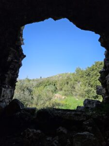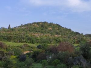 יורדים מהשביל ופונים עם השילוט לכיוון העצים העתיקים. סטייה של 150 מטרים במורד הגבעה מביאה אותנו לעץ זית עתיק בעל גזע חלול ורחב, עד שניתן להתחבא בתוך הגזע. מעט בהמשך אלון עתיק בן מאות שנים. נחזור לשביל ונמשיך למרומי התל. על הגדר שלט ענק אותיות הפונה לכיוון דרום, “החקלאות תנצח”. אנחנו עומדים מצידו הצפוני.