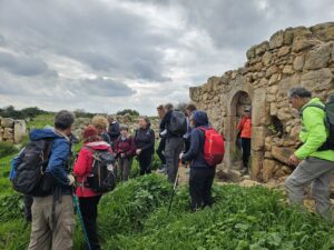 מתל גודד יורדים בשביל תלול מעט עד למנע בקר. יורדים בוואדי לכיוון מערב ועולים ממנו אל שלוחה שטוחה, עליה פורחות אלפי כלניות בחודש פברואר. פונים דרומה ליד מאהל בדואי, על ראש הגבעה, עץ תאנה במרכז חורבה נוספת, “עראק אל חלא”. חווה חקלאית מימי הבית-השני עליה הוקם מחנה צבאי רומי. ממזרח לנו, בתי קיבוץ בית גוברין.