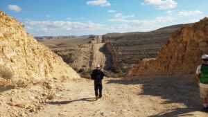 יוצאים מנווה המדבר ועולים אל רמת המדבר. בקצה העלייה מחכה לנו מדרגת סלע אותה עוברים בעזרת מאחזי יד הקבועים בסלע. ממשיכים דרומה על צד השלוחה במקביל לערוץ הנחל. שוב עולים אל שלוחת “סכין” צרה, המובילה אל רמת עבדת, עליה מתחברים אל דרך עפר רחבה הנקראת “ציר הנפט”.