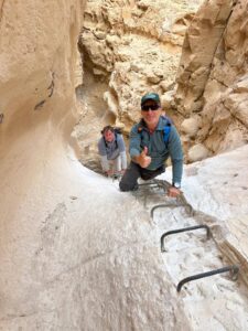 מסתייעים במאחזי היד ובמדרכי הרגל ובסולמות שהותקנו בקניון כדי לטפס על מפלי הסלע, להיכנס ולצאת מהגבים. אחד הגבים עמוק ואותו נעקוף מימין כדי להגיע לסולם בגובה של 12 מטרים. במקום זה הותקן מעקה בטיחות המסייע בגישה בטוחה לסולם. הגב נסגר למטיילים ומתוחם בחבל.