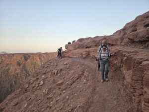 ממשיכים דרומה ועוברים ליד “מעבר צפרא”, נתיב גישה ססגוני וצר מהר האנטנה הסמוך אל גבול מצרים. כיום יש כאן כביש המשמש את כוחות הביטחון השומרים על הגבול. חוצים את הכביש ועולים על מדרון נחל גשרון, שעובר אל מצרים. מטפסים ב”מעלה גישרון” התלול אל רום שלוחת “סכין” ממנה תצפית מזרחה להר רחבעם הלבן, שבולט לצד הר יהושפט הכהה ומערבה אל נחל גישרון ואל המצוקים היפים שבצד המצרי.