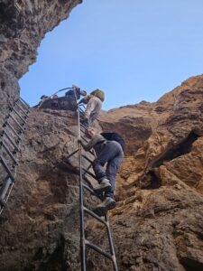 נחל גישרון עובר לצד המצרי, חוזר לישראל ולבסוף יורד שוב לטאבה. עולים על שלוחה קטנה ממנה יורדים בשביל לתוך יובל של נחל גישרון. לאט ובזהירות צולחים סדרת מפלי סלע ודרדרות בעזרת יתדות וסולמות עד לגב גישרון בערוץ הראשי של הנחל. באפיק הנחל תערובת של סלעי גרניט, אבני גיר ואבני חול בצבעים שונים, שנסחפו במהלך התחתרות נחל גישרון בשכבות סלע מתקופות גיאולוגיות שונות.
