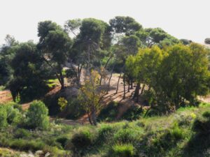 מהחורשה אפשר לראות את מדרונות גבעות הכורכר פצועים וחתוכים על ידי רכבי שטח. ממשיכים מערבה בשביל ולאחר כמה עשרות מטרים מגיעים לצומת T בה פונים ימינה אל חורשת האורנים העתיקים.(3)