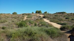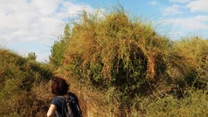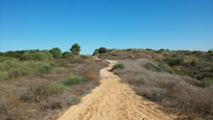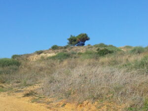 ליד הברוש מדרונות כורכר פצועים, עדות להשתוללות רכבי שטח. ממשיכים עד לדרך גבעות הכורכר.