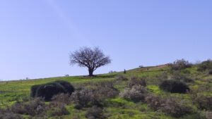 ממשיכים מערבה. בצד השביל צומח עץ שיזף הוא עץ הדומים. יש האומרים כי השיזף הוא האטד המקראי ממשל יותם –