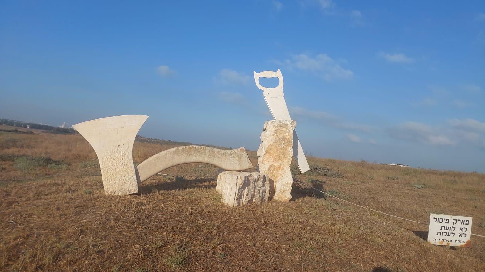 נמשיך דרומה אל ארסוף, נחלוף ליד פסלים סביבתיים מפתיעים. נהנה מפריחת חורף מוקדמת.